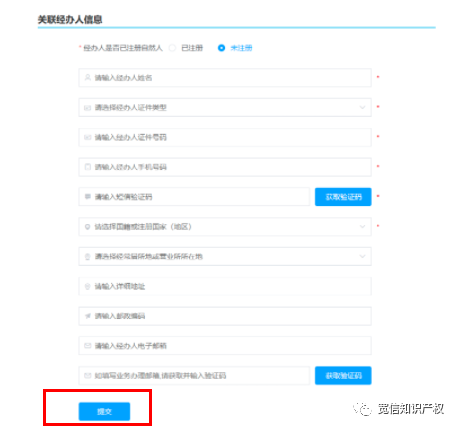 最上方經(jīng)辦人是否已注冊自然人:如經(jīng)辦人有個(gè)人賬號(hào),選擇已注冊輸入注冊信息點(diǎn)擊提交即可。