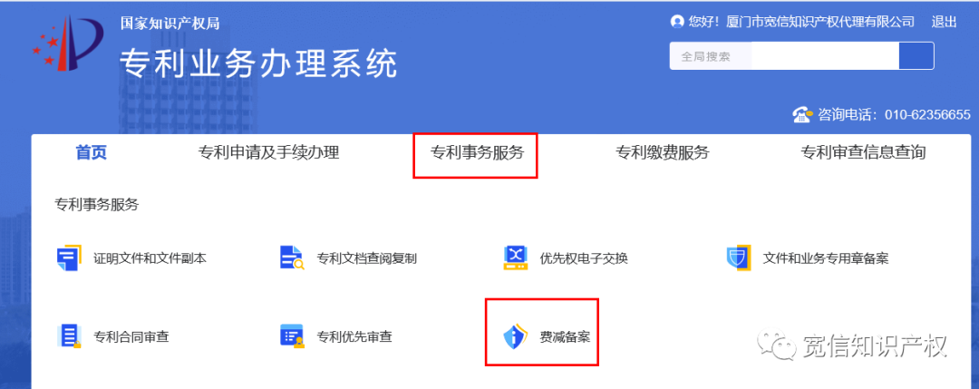 首頁選擇專利事務(wù)服務(wù)里的費(fèi)減備案。